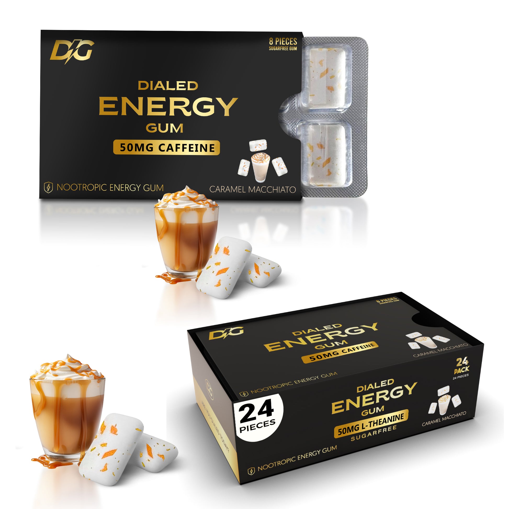 Each piece contains 50mg of natural caffeine alongside 50 mg of L-theanine and 25 mg of Taurine. Dialed Gum also has 0.8 mg of Vitamin B6 and 2.4 mcg of Vitamin B12, covering your recommended Daily Value of both!